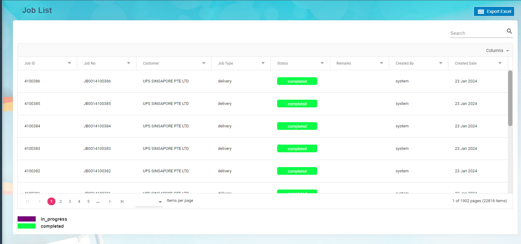 Job list viewed to maintain both completed and in progress job details in the system.