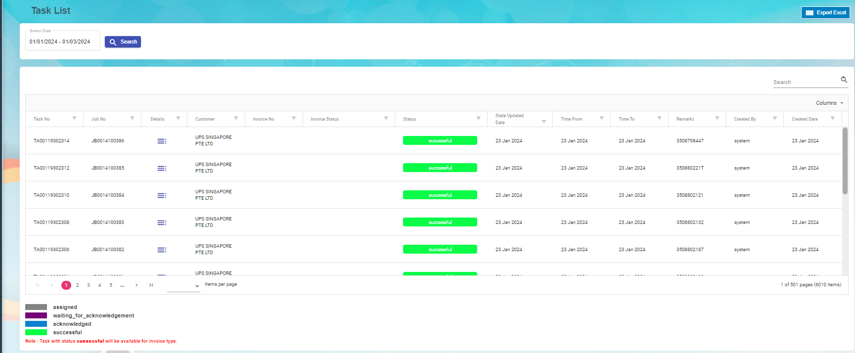 Task list viewed to contain assigned, waiting for acknowledgment, acknowledged and successful tasks.