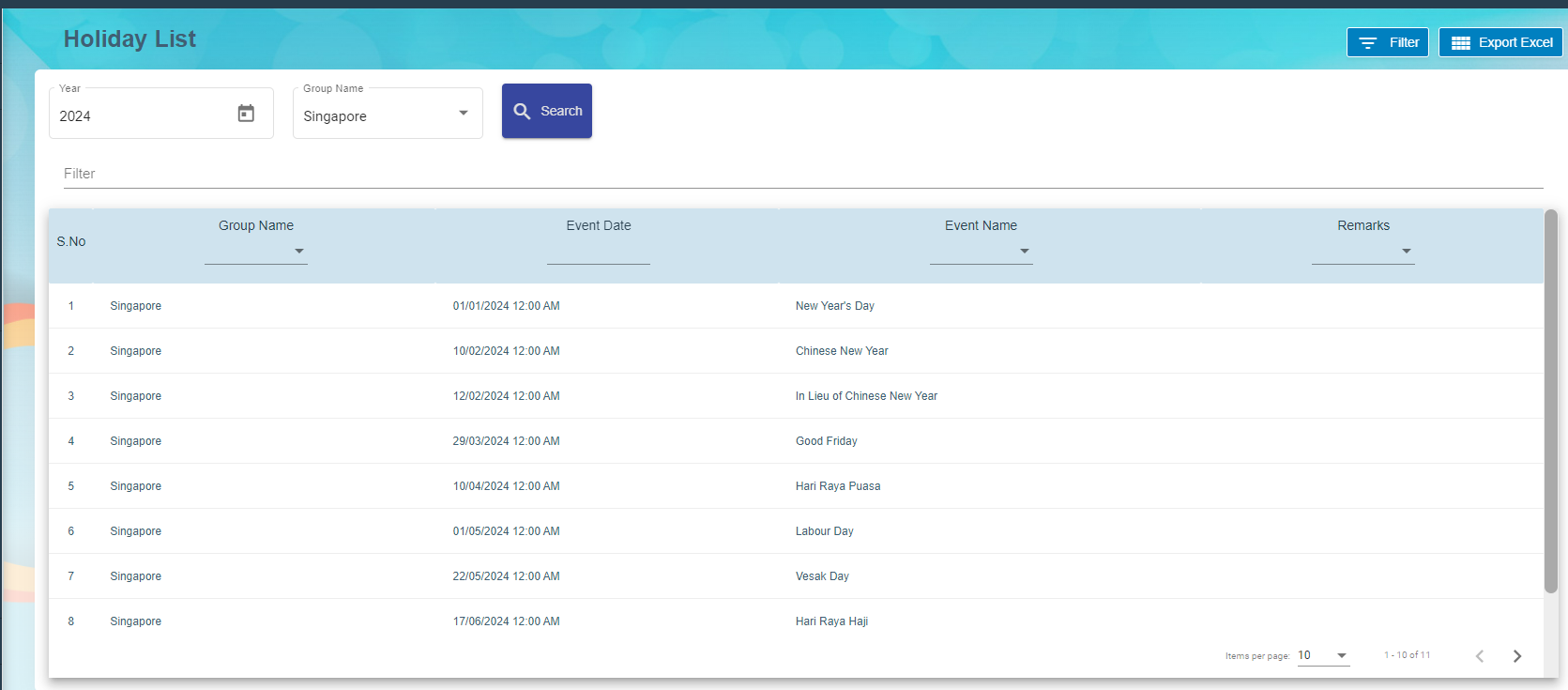 Holiday list viewed to maintain the holidays based on the Group Name and the Year. Group Name contains the country name such as Singapore, Malaysia etc.,