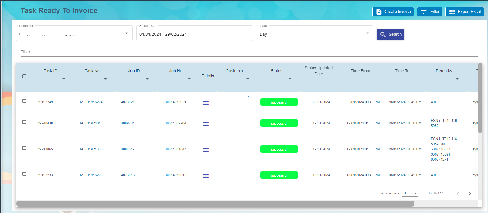 - Choose Customer in the Task ready to invoice and the date range. Select Type either Day, Month or Ad-Hoc.