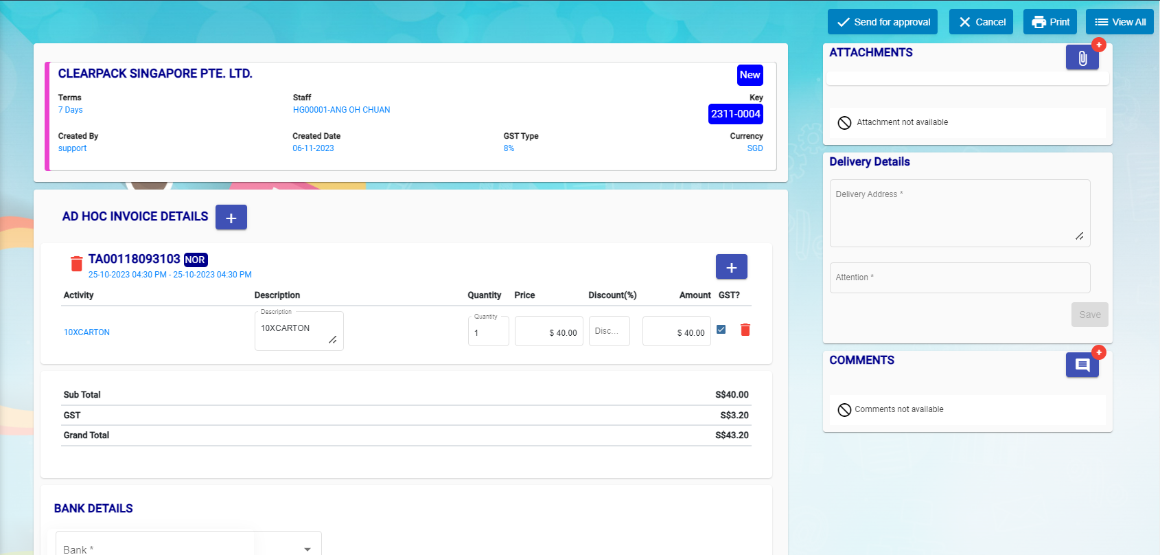 - Click add button beside to Ad-Hoc Invoice details.