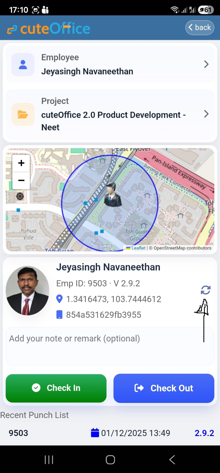- Please click on the highlighted icon to do the sync on the mobile to see the project list (depends on the device activation as per below point) and profile image.
