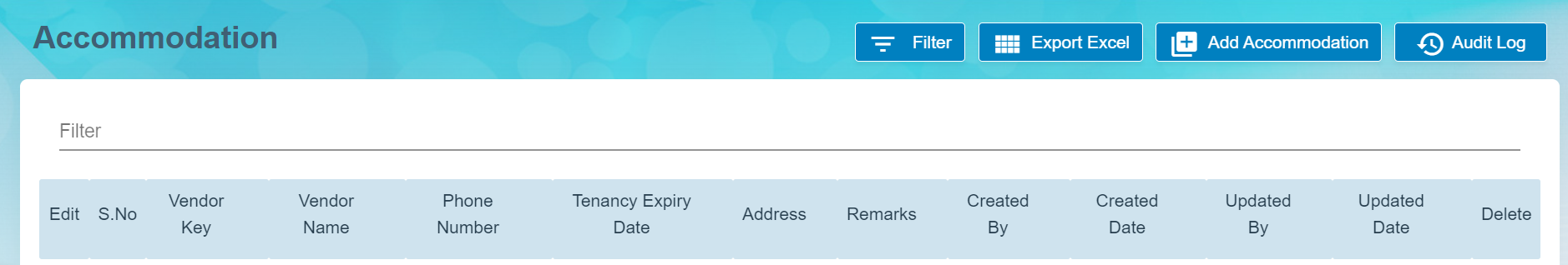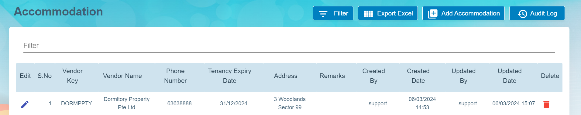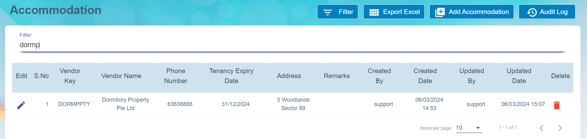 The Accommodation submenu in the HUMAN RESOURCES page helps to track and forecast the company's dormitory vacancies i.e. to help the HR team to better manage the dormitory accommodation provided to the foreign employees.
