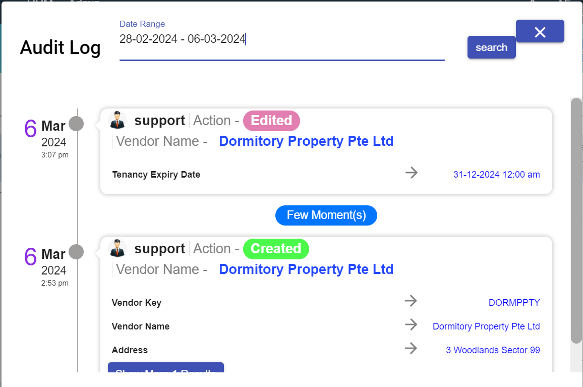 System will display those vendor dormitory record(s) when the tenancy date is 15 days before the tenancy date of the vendor dormitory record(s) as shown in the below example where this vendor dormitory record has a tenancy expiry date of 15 October 2024.