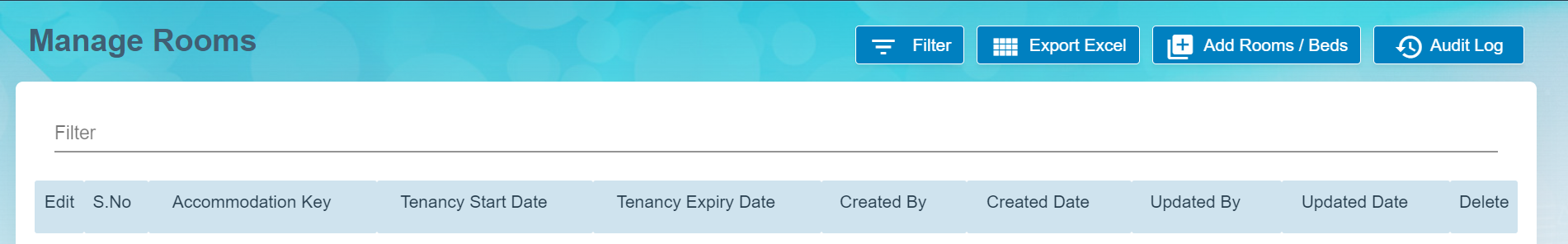 The Rooms/Beds menu item in the Accommodation submenu helps you to create the master data of the rooms and beds of the dormitory accommodation record. Click on this and it will show the Manage Rooms page to allow you to add or update the rooms and beds provided by the respective dormitory operator/vendor.