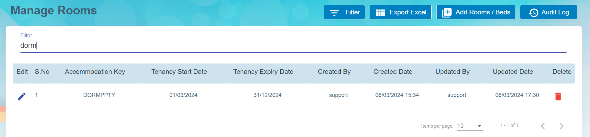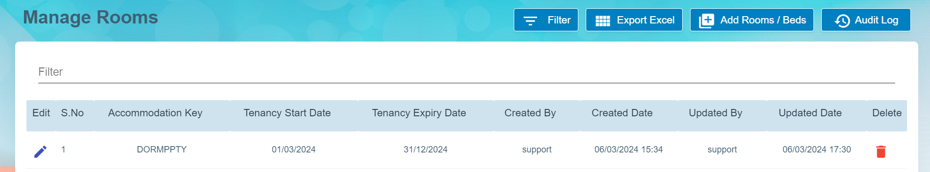 You can edit the details of the added rooms and/or beds record by using the edit option provided in the Edit column of the Manage Rooms page. Click