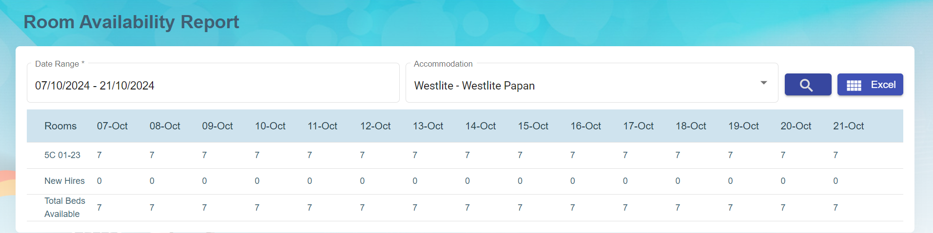 button to search. Based on these two search criteria, system will display the results on the screen showing the room availability of the selected vendor dormitory record. For New Hires row in the report, if there is a number, it means that there is new hire but not allocated the dormitory room/bed number. In the results shown below, there is no new hire based on the date range input in the report.