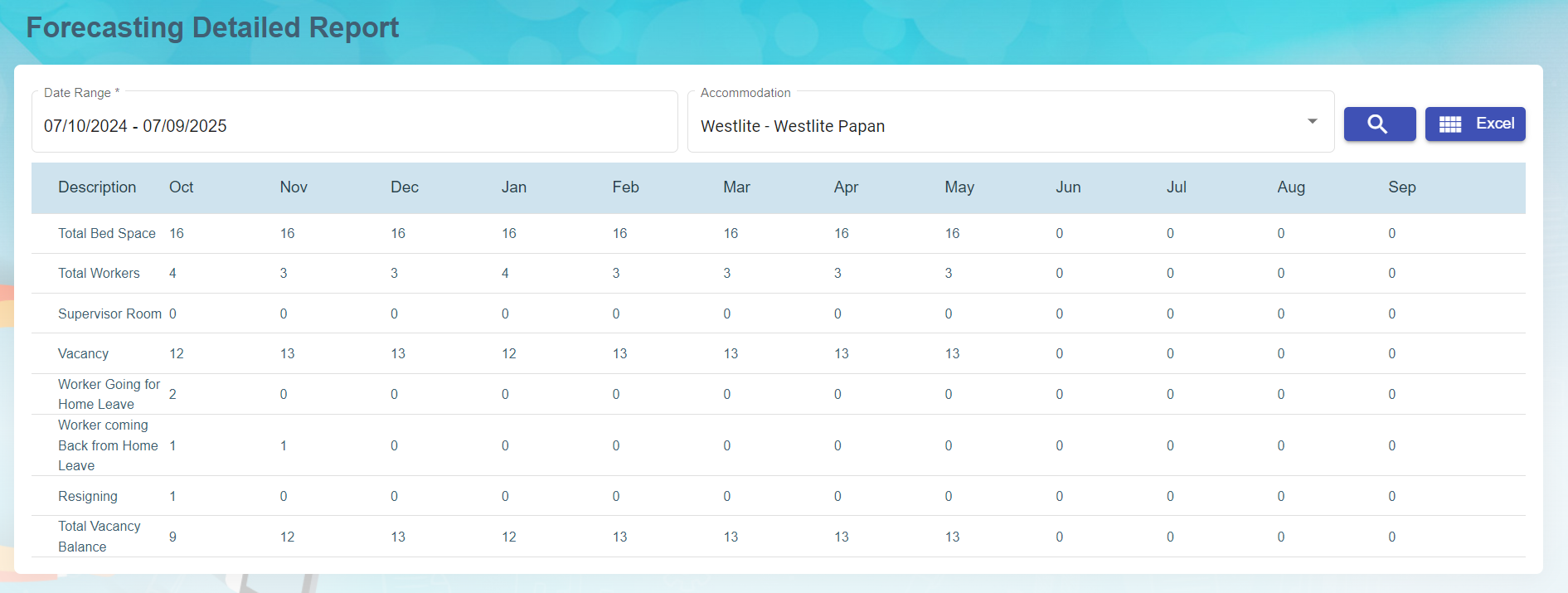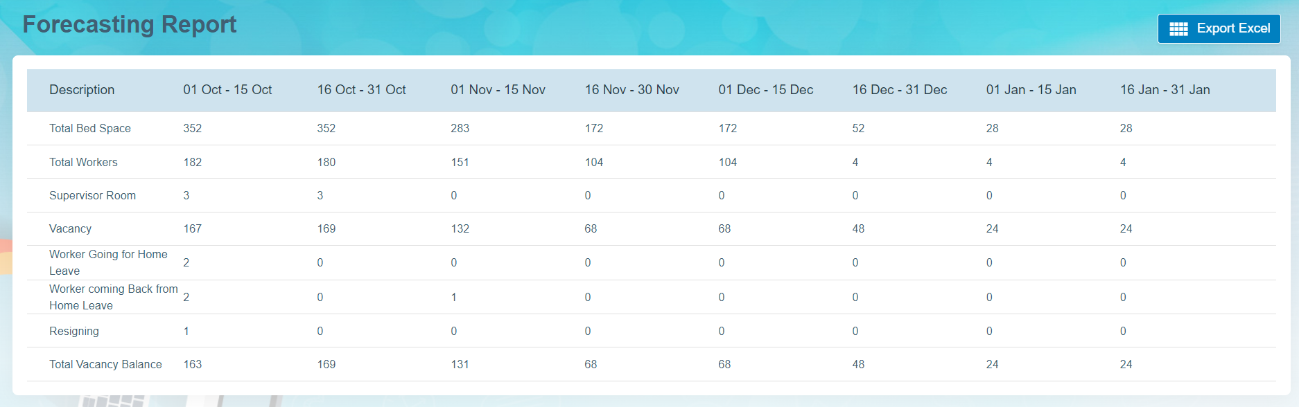 The Forecasting Report menu item in the Accommodation submenu helps you to view the statistics of the dormitories' vacancies and also forecast of the future occupancy for the next 2-3 months based on the factors such as employee's home leave and employee's resignation if there is any.