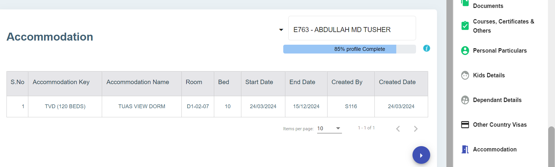 Once selected and click Save button, the selected dorm room number will be saved against the selected hrm employee record and the record will be shown in the Accommodation page of the hrm employee record.
