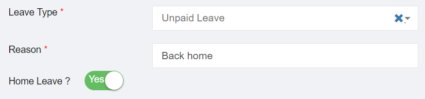 Note: When creating worker's home leave application in the E-Leave module, you need to select Leave Type = Unpaid Leave and Home Leave? option to set to Yes.
