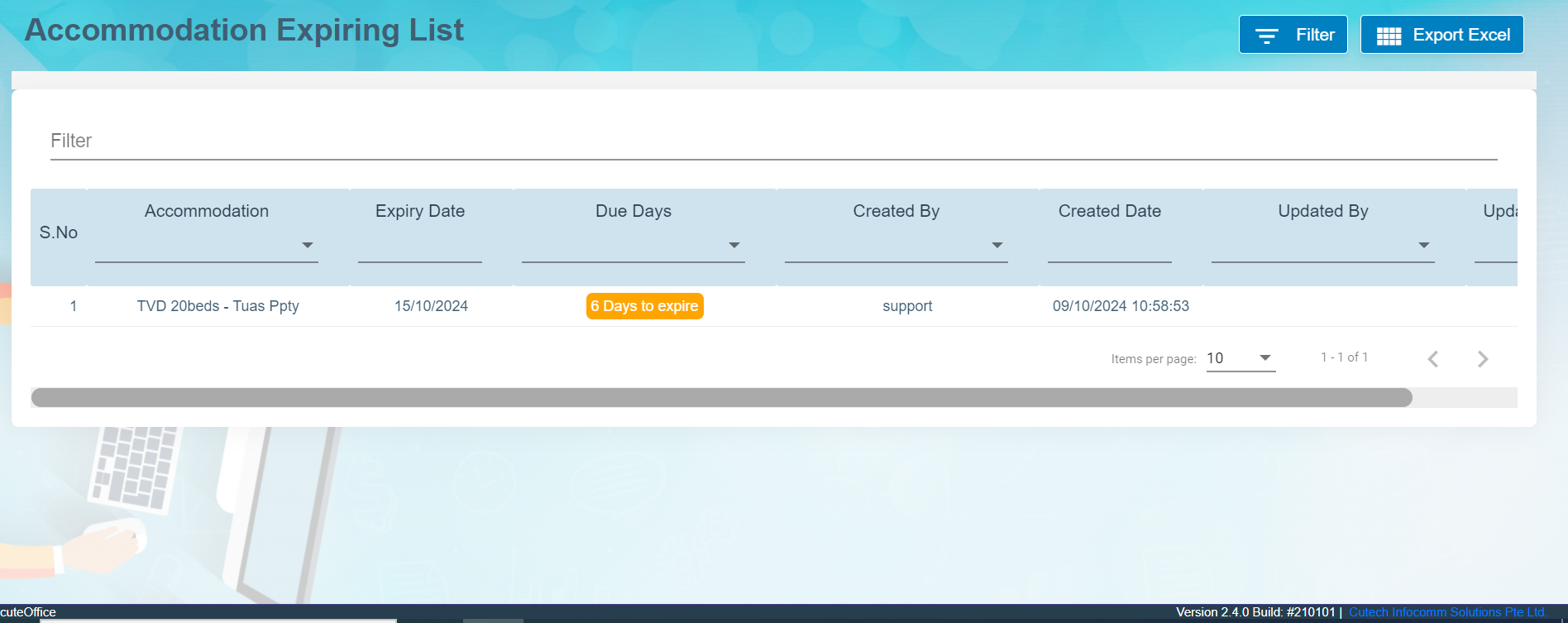 If you want to view a specific accommodation record, you can use the filter option provided in the upper right corner of the Accommodation page. Click