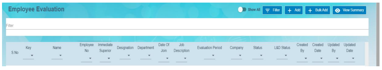 Employee evaluation page manages evaluation for all employees. Click Evaluation tab in Employee menu, the employee evaluation list page shows as below