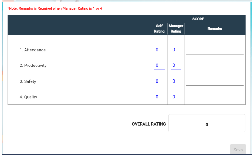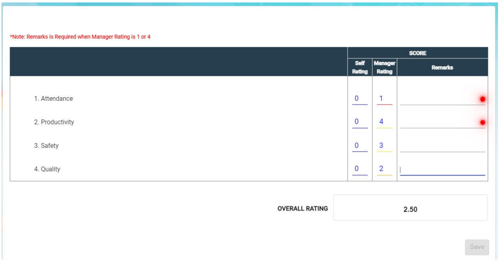 - Supervisor needs to enter the rating at the Manager Rating column for each evaluation item. System will indicate a red mark at the Remarks column if the lowest rating of 1 or highest rating of 4 is entered and it is mandatory for the supervisor to enter remarks for this low or high rating. If there is no input for the mandatory remarks, the Save button is disabled.