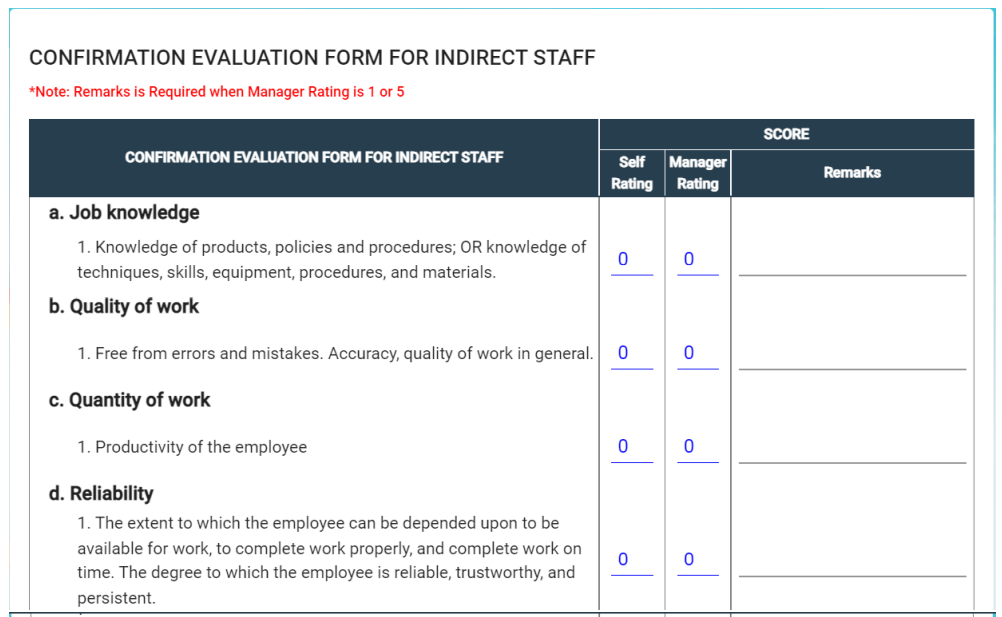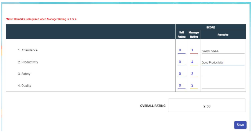- Supervisor is required to enter the rating at the Manager Rating column for each evaluation item. System will indicate a red mark at the Remarks column if the lowest rating of 1 or highest rating of 5 is entered and it is mandatory for the supervisor to enter remarks for this low or high rating. If there is no input for the mandatory remarks then the Save button is disabled. The Red indicator disappears after supervisor inputs remarks.