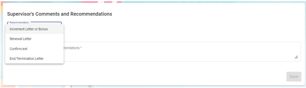 - At this Supervisor’s Comments and Recommendations section, the supervisor is required to select one of the options in the dropdown list and key in comments.