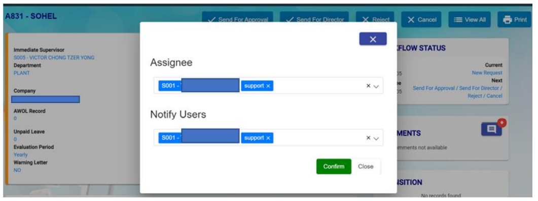 send to supervisor icon, system will auto populate the Assignee and Notify Users fields and click Confirm button to send.