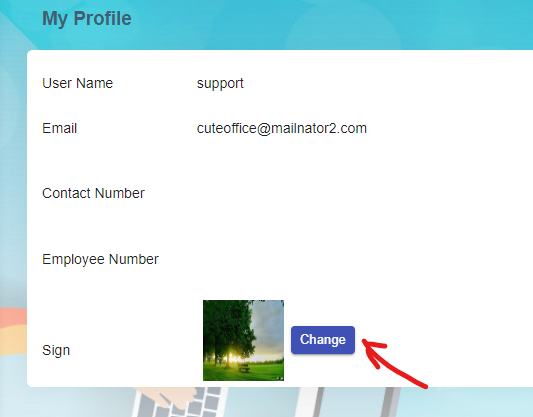 - In the My Profile screen, click on the Change button. To update signature as per below screenshot. User can sign on the blank space or click upload signature button to upload a signature image file and click Save button. Once sign/upload and save, this signature will appear on the employee evaluation form.
