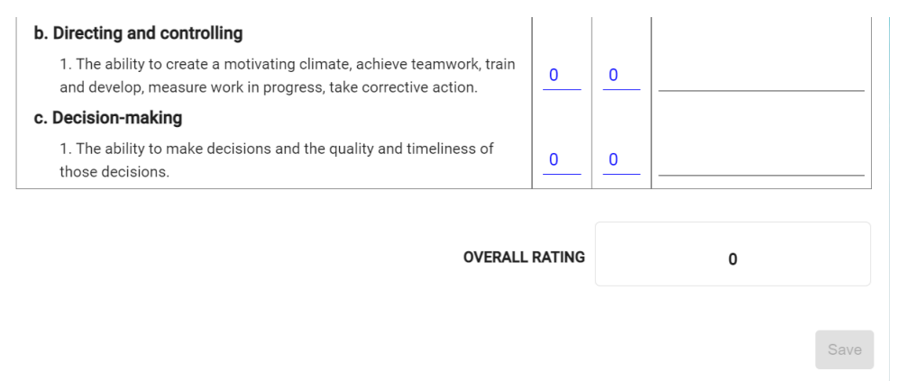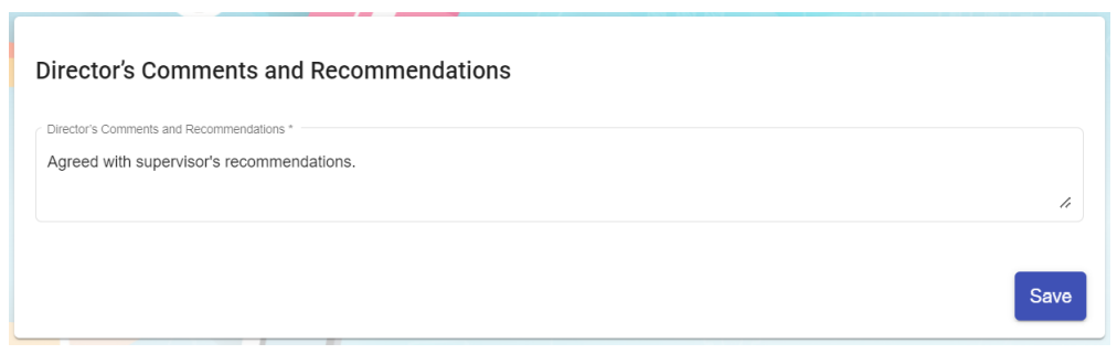 - Director will review the supervisor’s ratings, comments and recommendations and he is required to input his comments and recommendations in the below section. Once done, the Save button will be enabled.