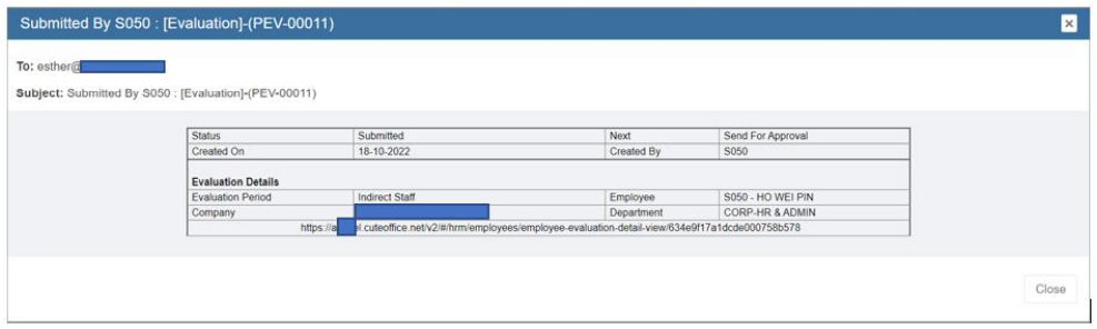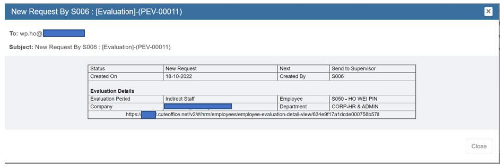 - Employee will receive an email notification when his/her employee evaluation was created in the system.