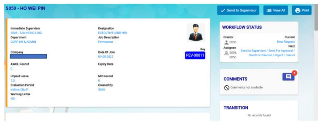 - Supervisor need to click the key of each new evaluation request (with status being "New Request").