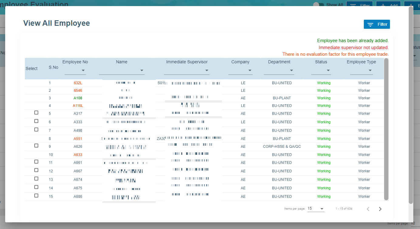 - Select employees by ticking the box in front of the employee names. Note: please check the color code in the top right corner of the page for those employees that are not in selection list.