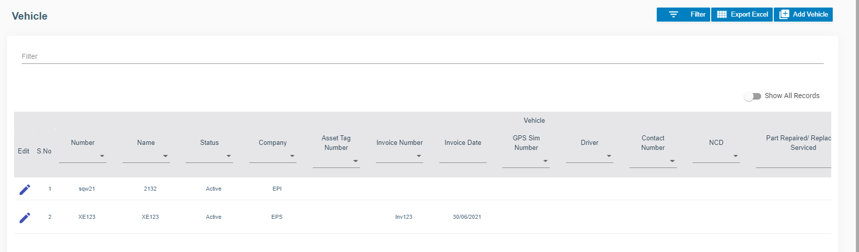 If you want to view any specific vehicle details among multiple vehicles listed in the Vehicle page, you can use the filter option provided in the upper right corner of the Vehicle page. Click