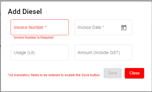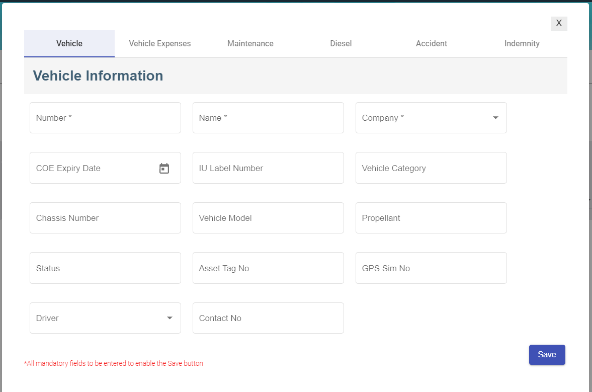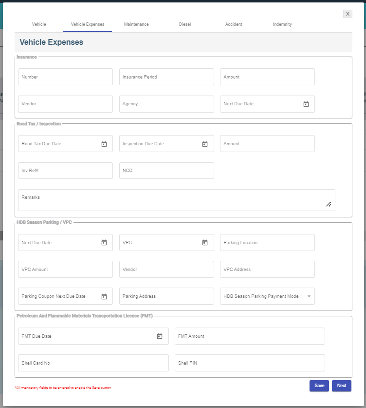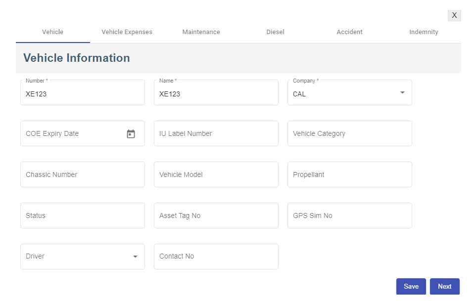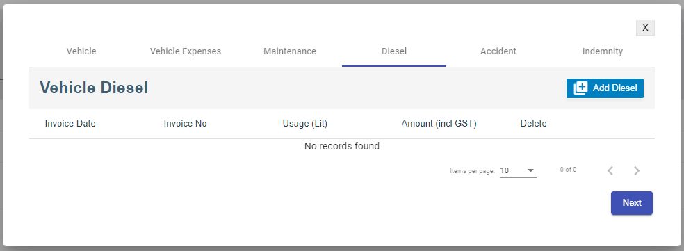 - Click Save, then click Next, the Vehicle Diesel tab will open.