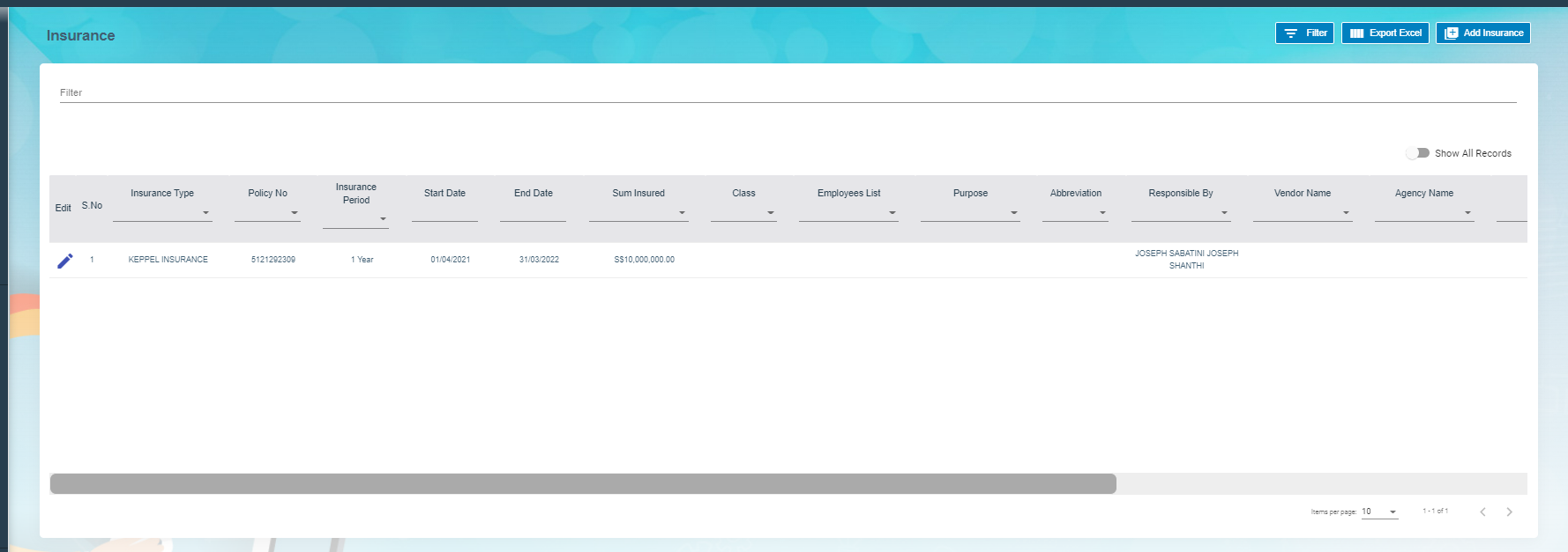 The Insurance tab in the Others submenu helps you to add the details of various insurance policy that is taken by the company. If you want to add an insurance, click the Insurance tab in the Others. The Insurance page opens.