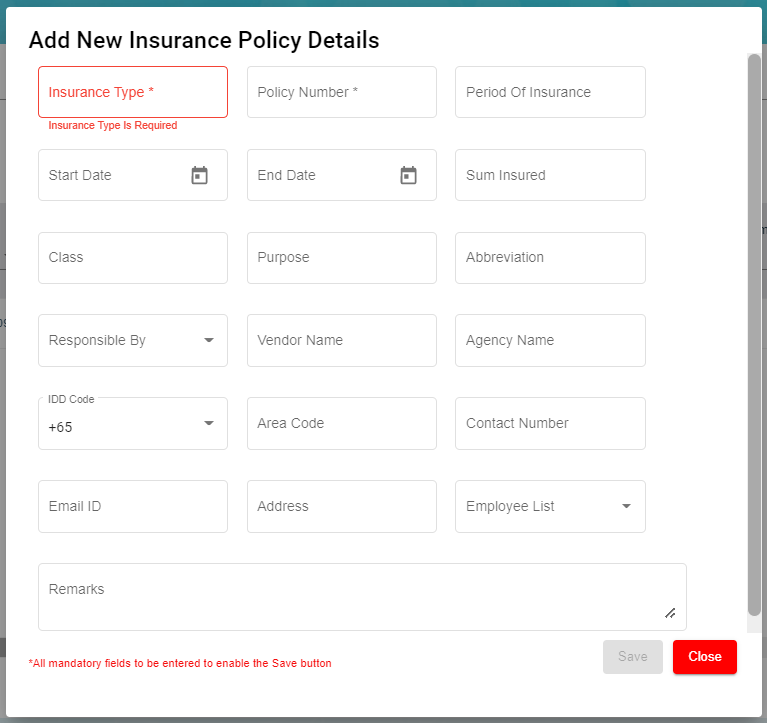 (Add Insurance button) in the Insurance, the Add New Insurance Policy Details window opens,