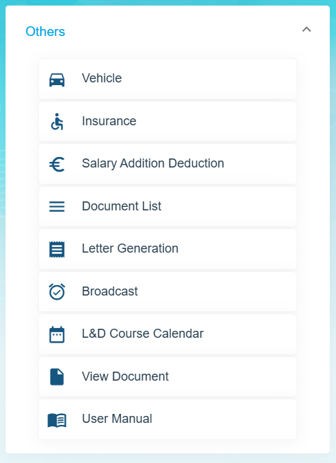 The Vehicle tab in the Others submenu helps you to add the details of vehicles belongs to the company including vehicle type, vehicle insurance, maintenance, and season parking pass details. Click the Vehicle tab in the Others. The Vehicle page opens.