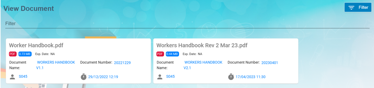 User can view the document which was created for public view within the company. Click on the title e.g. Worker Handbook.pdf to trigger download of the document for viewing.