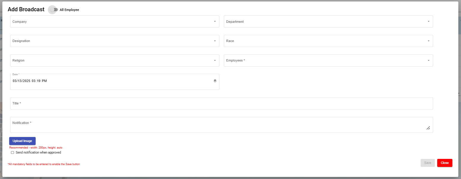 - Select Employee in the Employees field and this is mandatory to select which employee(s) for this broadcast message.