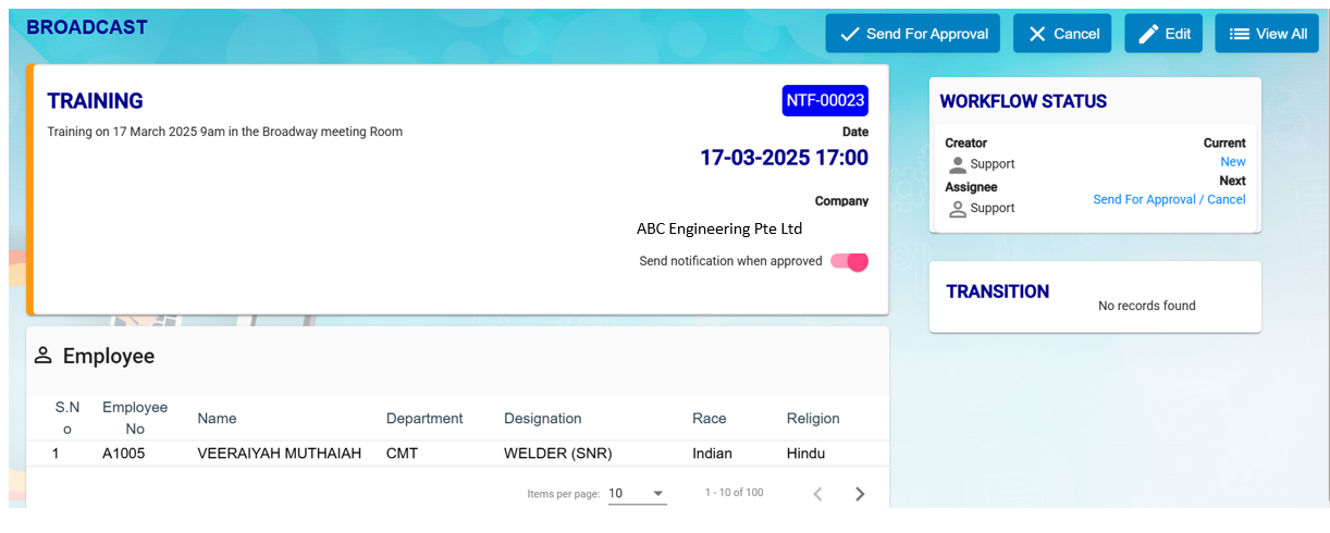 User can create broadcast message to a group of selected employees within the company. To view the screen, enable "menuNotification", "hrmNotificationCreator" and "hrmNotificationApprover" permission under HRM module.