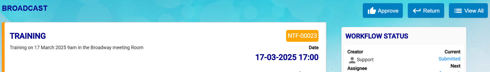 button to send to the required authorised person to approve this broadcast message before sending to the selected employee(s). The status will change from