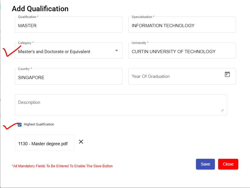 Edit the highest education record and mark as highest an also make sure to select the category of education such as master , bachelor etc