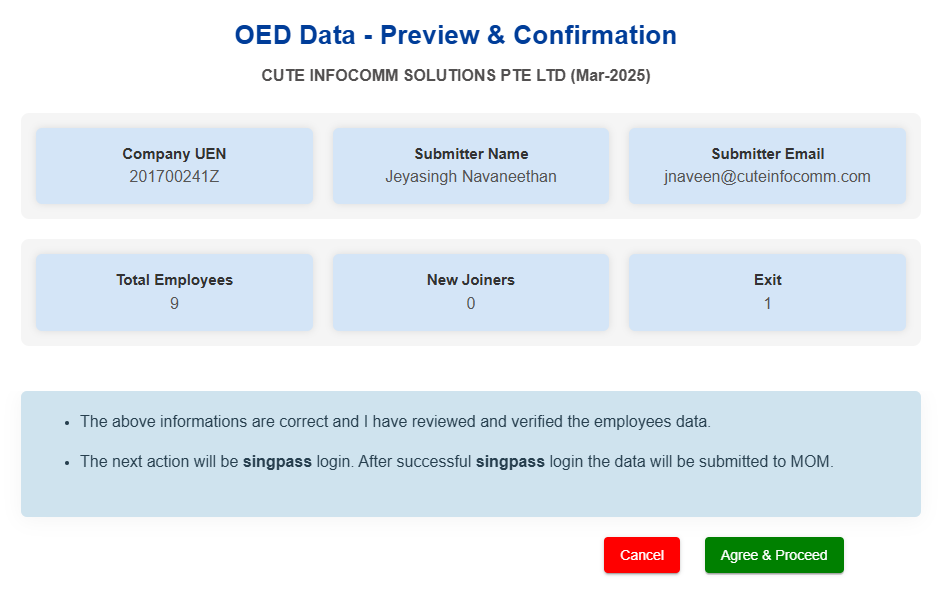 The summary is shown and Click Agree & Proceed to login with SingPass and submit the OED data to MOM.