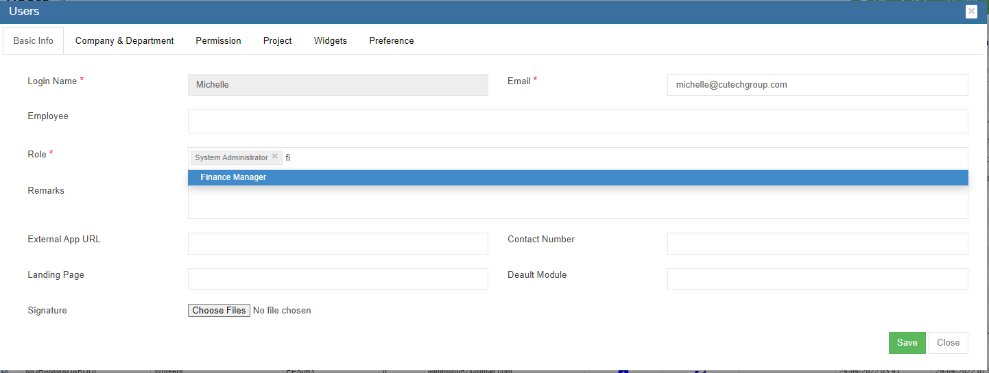 Note: It is highly recommended to define permission in user role and then assign user roles to a specific user account, so that users who perform same duty in cuteOffice will have same permissions. Roles are defined by a set of permissions to different functionalities in cuteOffice system. Based on company operation needs or organization structure, system admin user can create finance roles, such as finance manager etc., and give required permission to these roles and assign role to user.