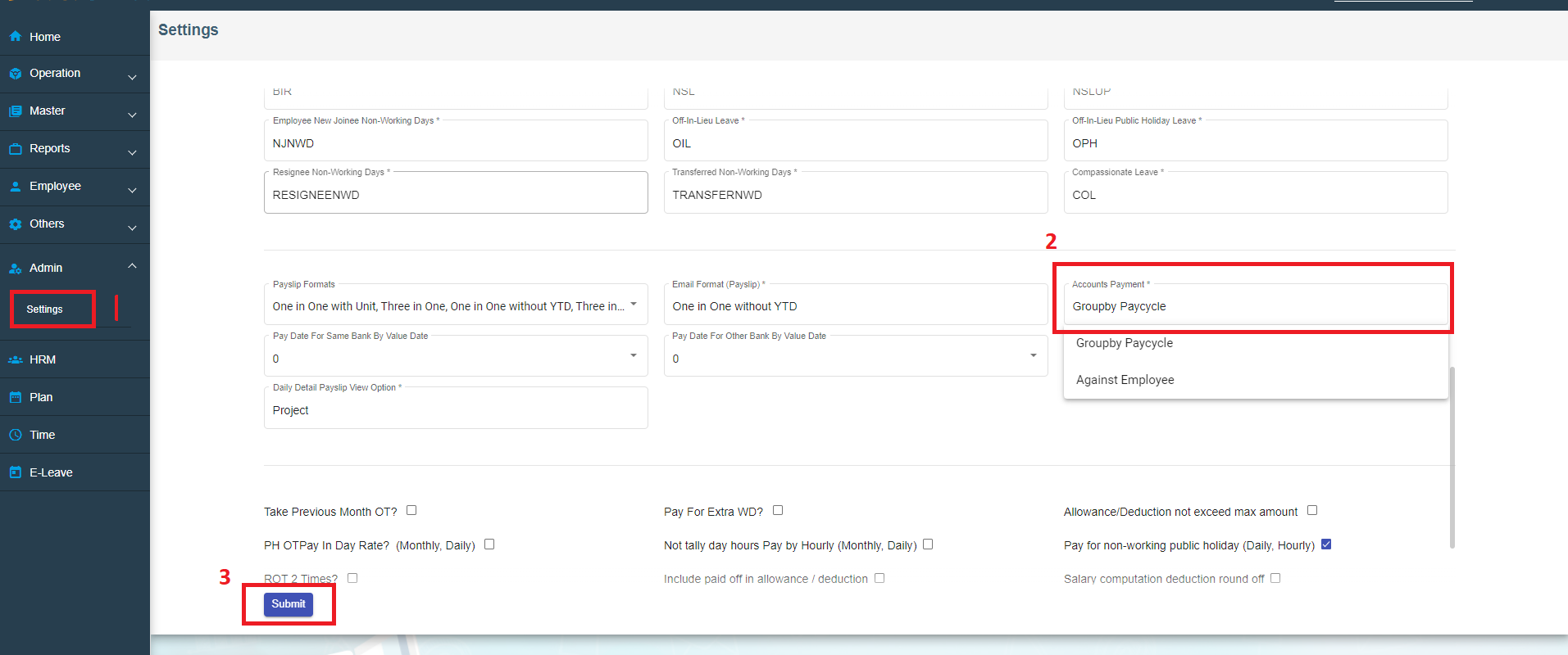 - Scroll down the page to find Account Payment box, and select "Groupby Paycycle" as account payment setting.
