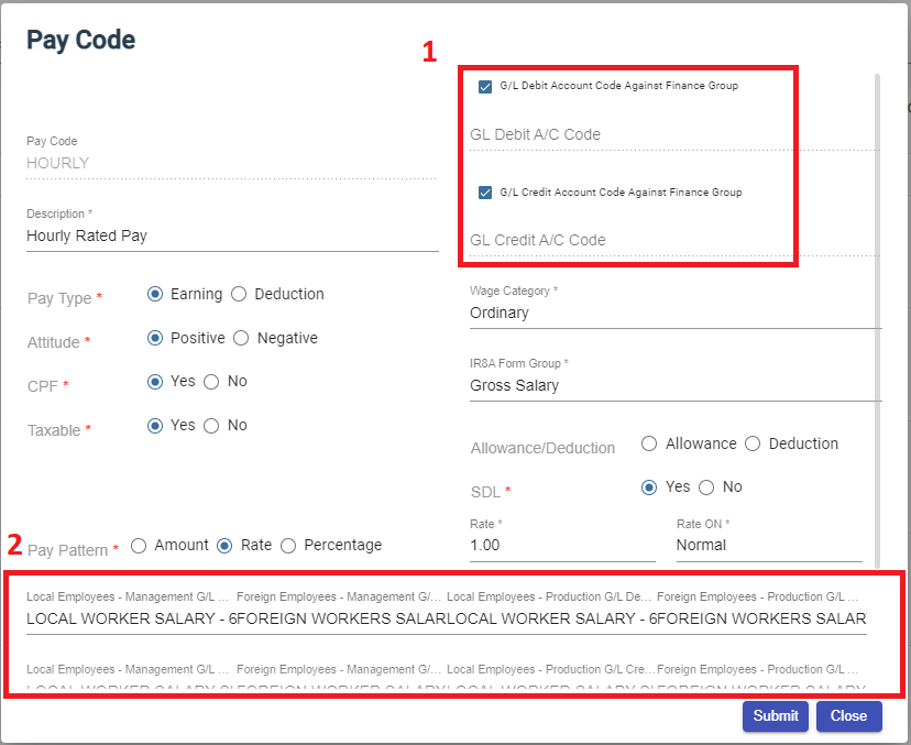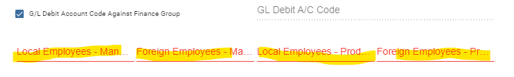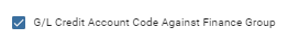 - If user wants to map G/L account code against finance group, tick relevant box in area 3, and select G/L account code to map to each finance group as shown in below yellow highlight area,