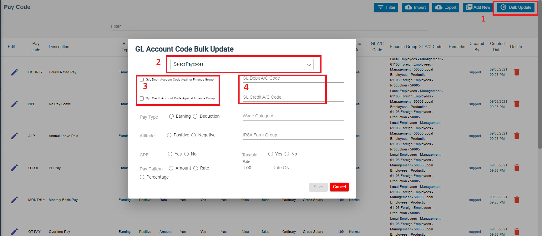 - To map account code in one stretch, use the bulk update option of G/L Account Code for multiple pay codes, click