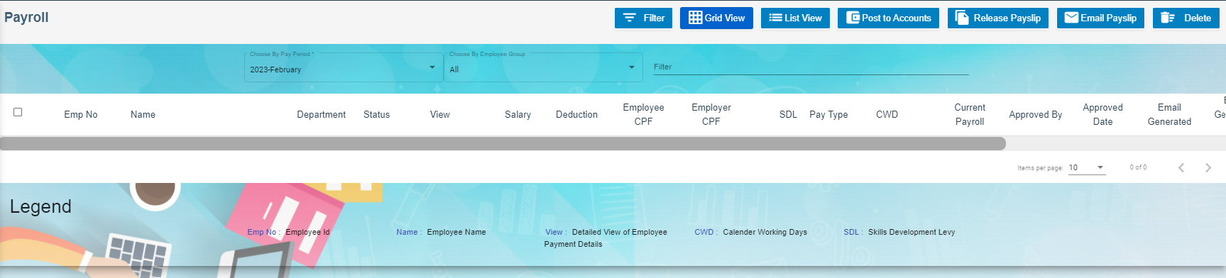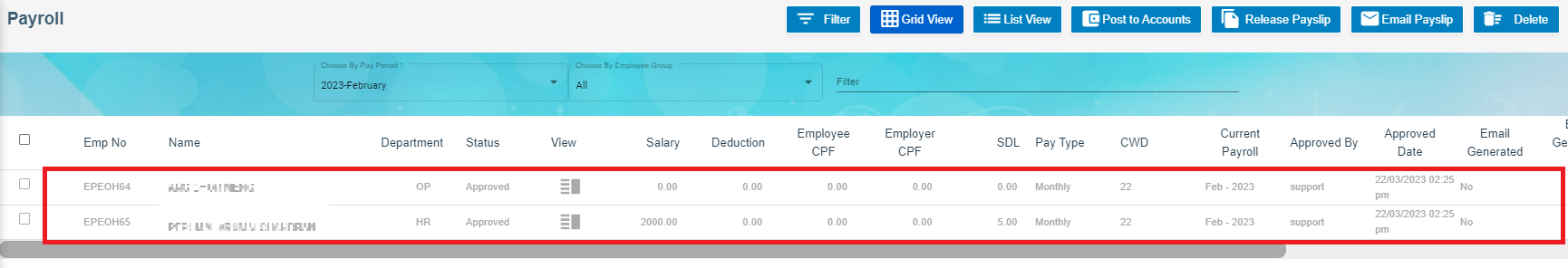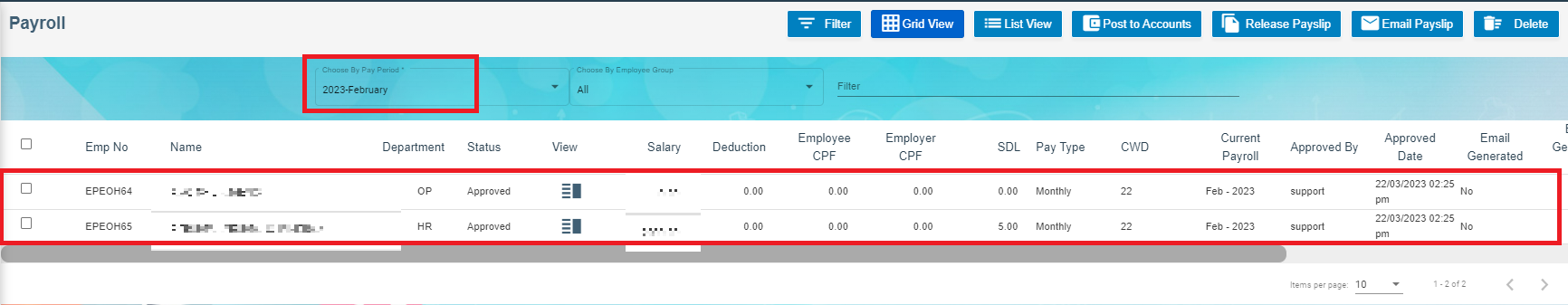 - In Choose Pay Period box, select pay period to post in accounts, all approved employees' payroll for selected pay period will be displayed,