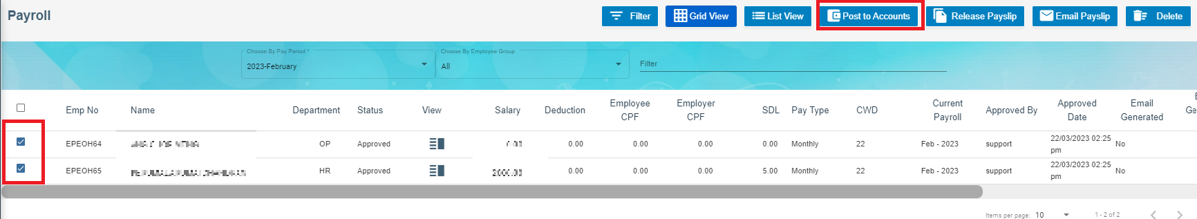 - Tick the box in front of employees' name to select employee(s) to post to accounts,