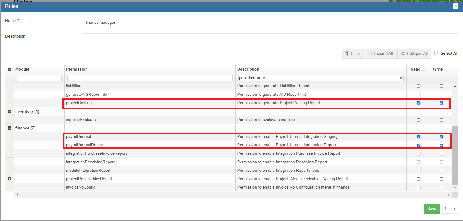 - Search and enable below Read & Write permissions (click filter and filter permission names "projectCosting","payrollJournal", "payrollJournalReport").