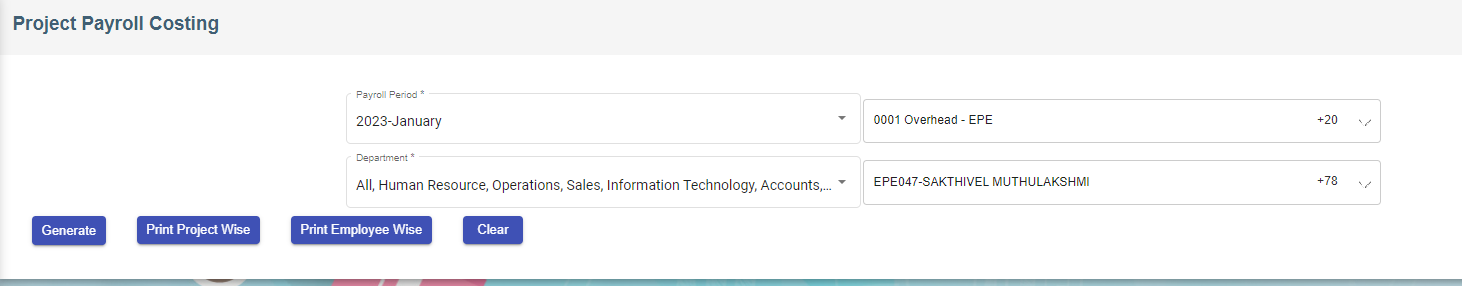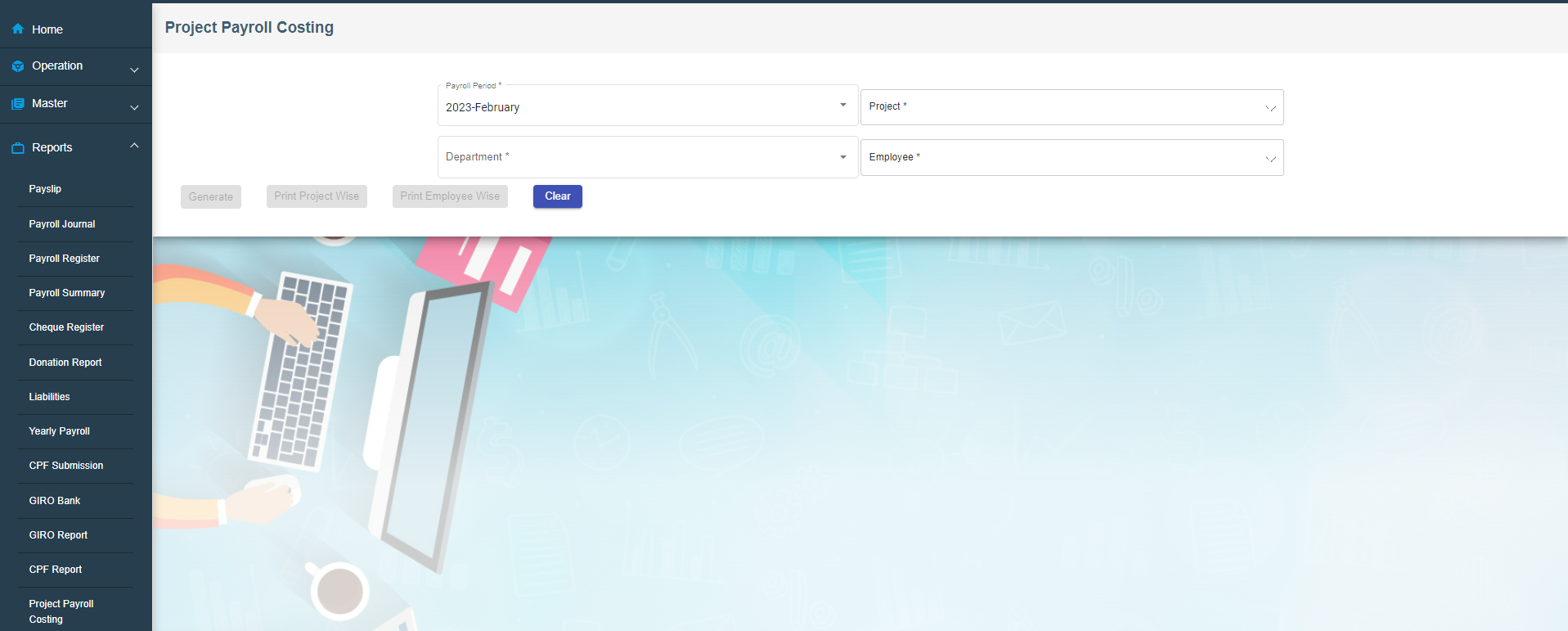 - Go to HRM-payroll module, navigate to Reports menu, click Project Payroll Costing submenu,
