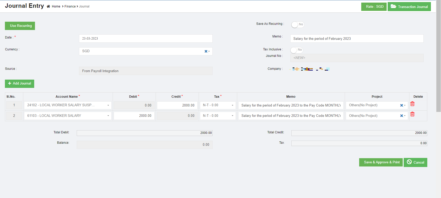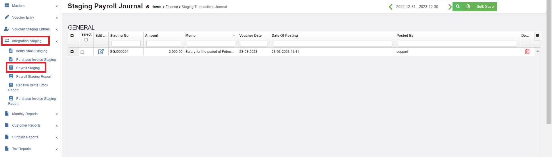 As part of Integration, the vouchers will be generated for the above 2 scenarios (as selected by the customer) and linked to the Financial Module Staging location. Subsequently, customer need to approve the vouchers in the Staging location which will then reflect in the Accounting entries as per the configuration created.