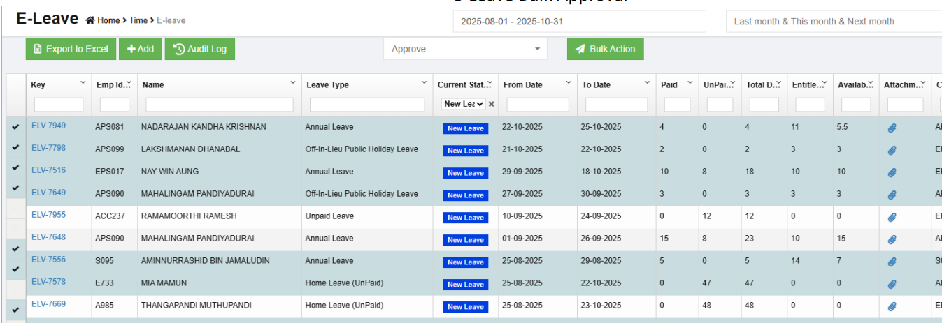 System allows user to use bulk leave approval at E-Leave viewall page once user has the bulkApprove permission. MC attachments and information on employee's remaining entitlement for sick leave, hospitalisation leave, AL, off-in-lieu, childcare leave now available to users at a glance without having to click into each specific leave type. MC attachments are available for viewing instead of downloading at the E-Leave viewall page.