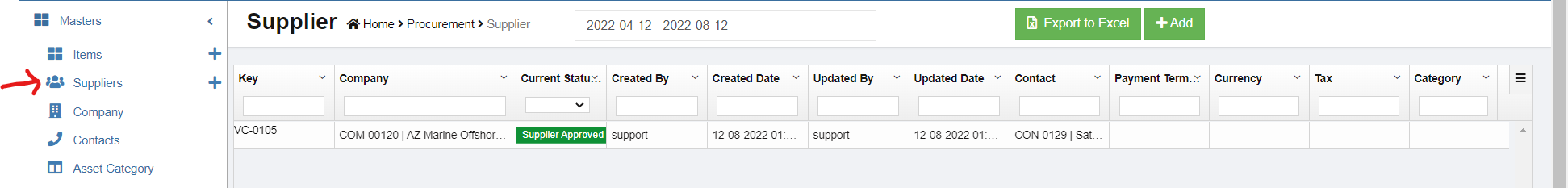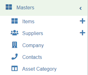 The Masters menu in the procurement module helps to define and manage the master data like items detail, suppliers, company, contact, and asset category.