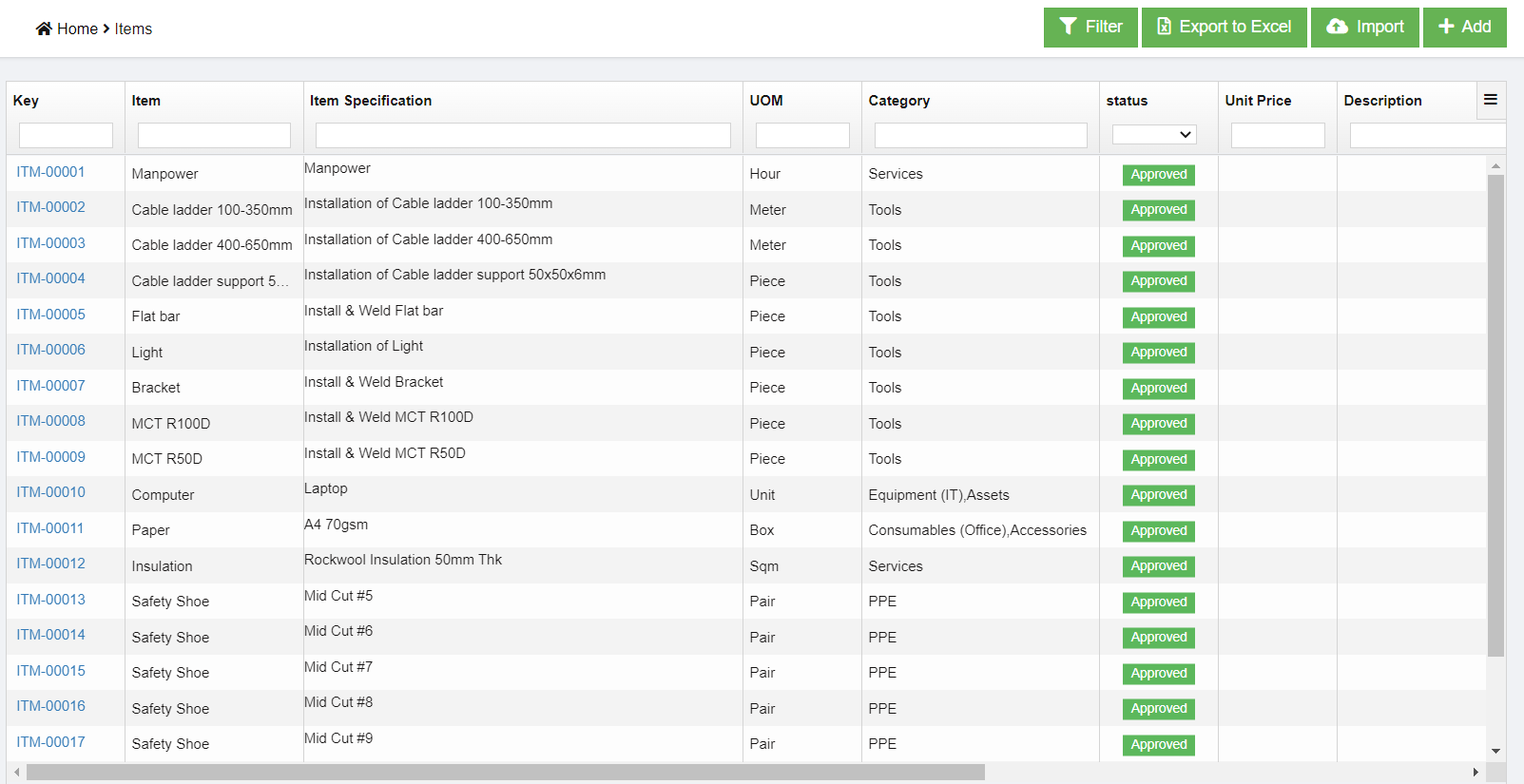 The list of items that will be used in procurement module is managed in cuteOffice Items master. They are managed centrally so that duplicate items are not entered into the system.