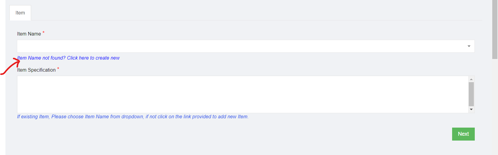 - Select the Item from list. If you can’t find the item, then click “Item Name not found? Click here to create new” link below the text box,