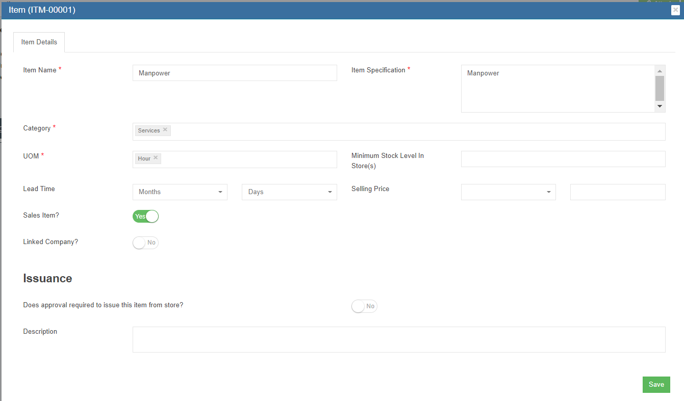 - When issue this item, if it requires approval, click to enable flag as Yes, or default as No,